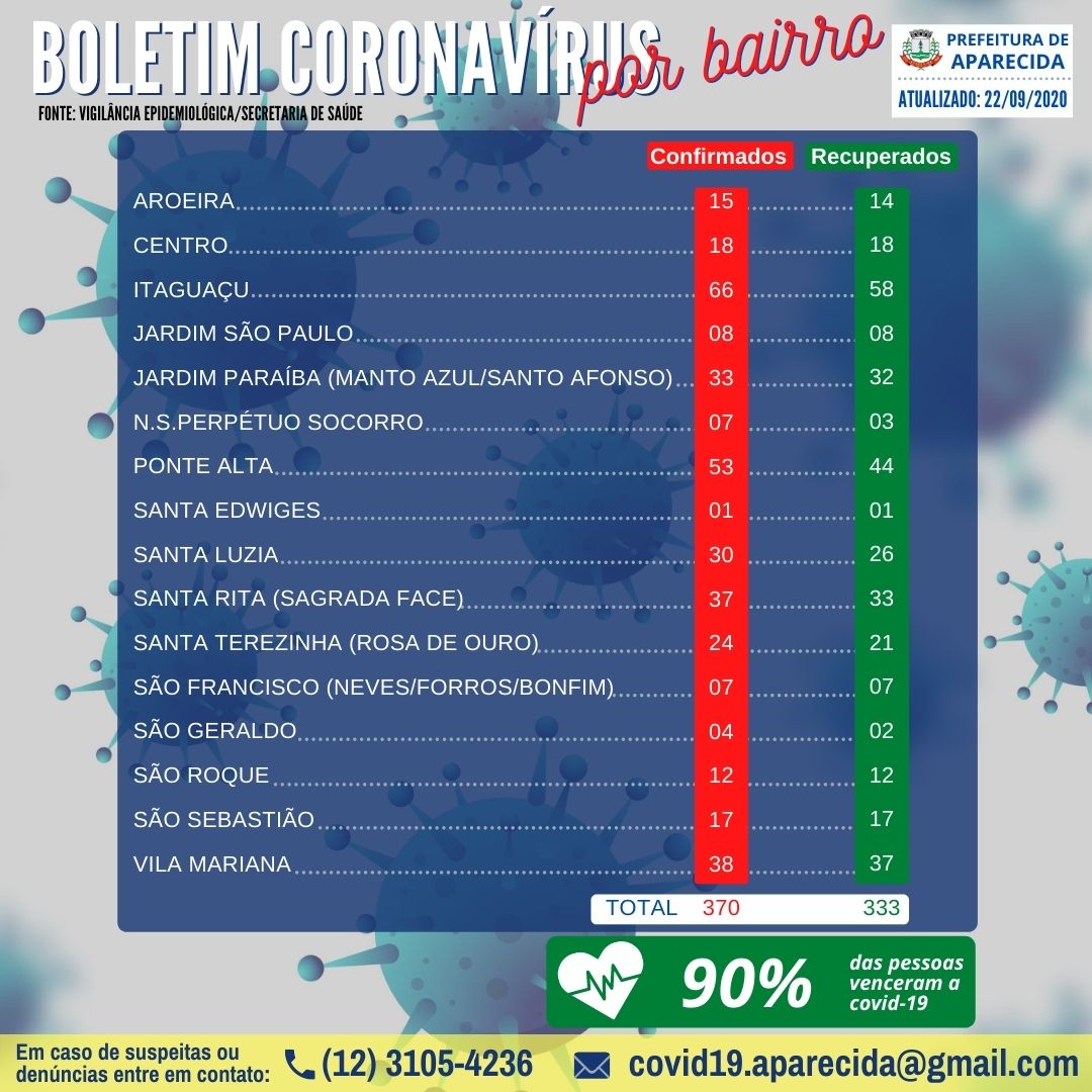 Aparecida contabiliza 370 casos confirmados, sendo 333 recuperados (90% do total de casos confirmados), 23 pessoas em isolamento domiciliar, 02 pessoas internadas na ALA COVID da Santa Casa e 12 óbitos.